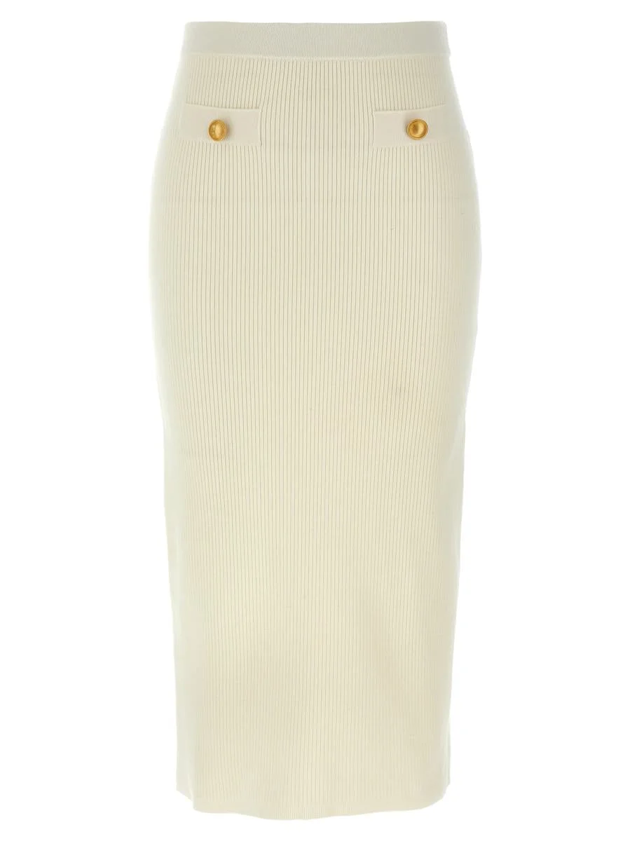 Midi skirt in ribbed stretch wool and cashmere blend, trompe l'oeil front pockets with metal buttons, elastic waistband, pencil style with back split Gender: Women Material: 90% WOOL, 10% CASHMERE Color: WHITE Made in: IT Product ID: FABX4047K45140001 *Import tax/duty will be calculated at checkout (If applicable)