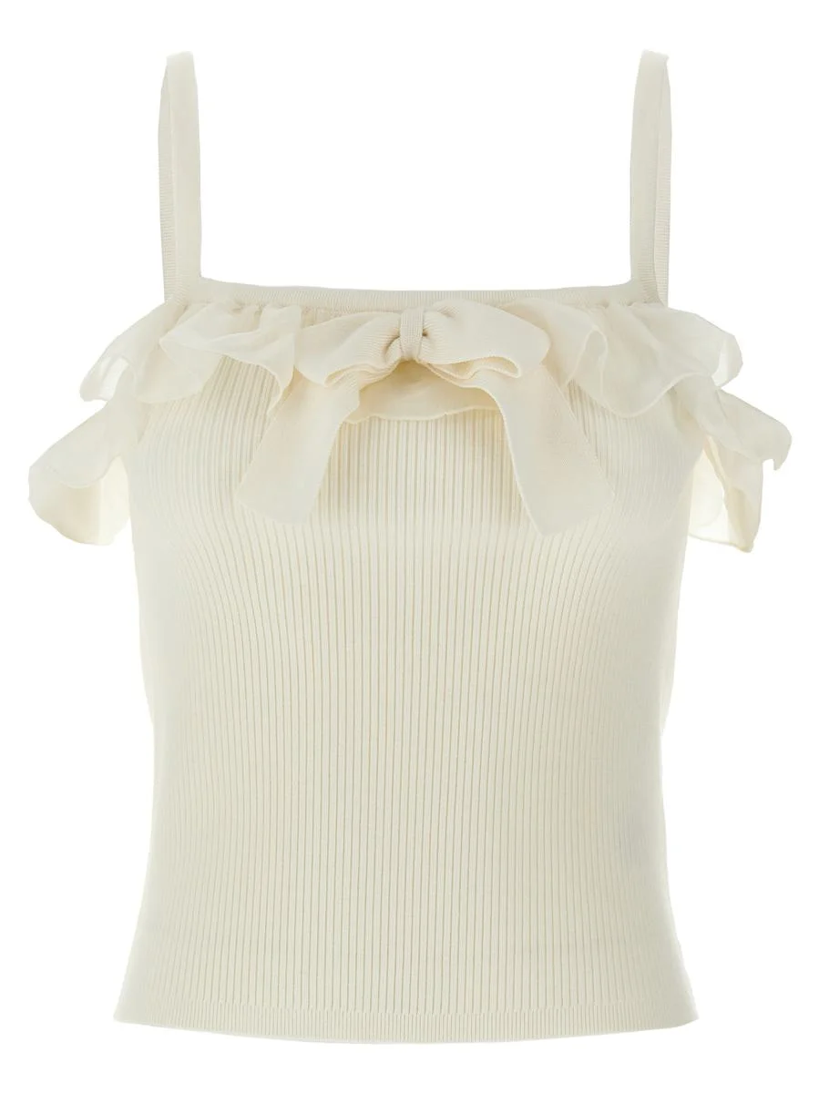 Ribbed stretch wool and cashmere blend top, square neckline with ruffles and maxi front bow, crop style and thin straps Gender: Women Material: 90% WOOL, 10% CASHMERE Color: WHITE Made in: IT Product ID: FABX4046K45140001 *Import tax/duty will be calculated at checkout (If applicable)