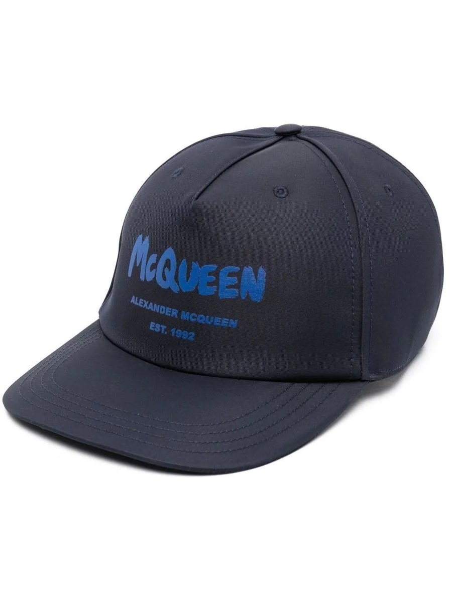 Graffiti-print baseball cap from Alexander McQueen featuring navy blue, cotton, signature Graffiti print, logo print to the front, five-panel construction, curved peak and adjustable strap to the rear. BRIM: 7.2 Centimetres CIRCUMFERENCE: 55.5 Centimetres Gender: Men Material: LINING: COTTON 100% OUTER: POLYESTER 100% Color: BLUE Made in: IT Product ID: 6677784404Q4169 *Import tax/duty will be calculated at checkout (If applicable)