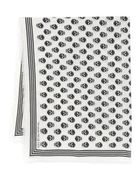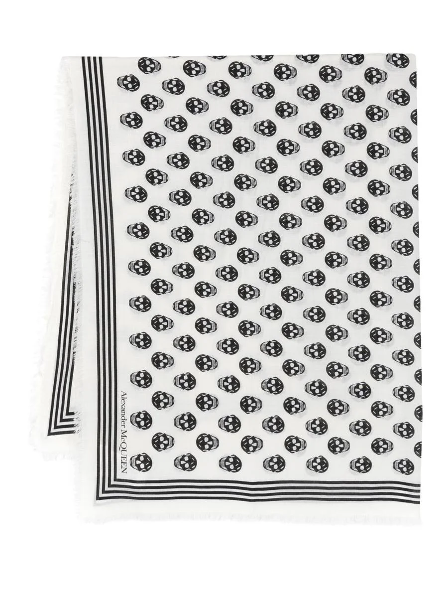 skull-print lightweight wool scarf from Alexander McQueen featuring white/black, wool, skull print, fine knit, lightweight construction, stripe trim and logo print to the front. LENGTH: 120.0 Centimetres WIDTH: 140.0 Centimetres Gender: Women Material: WOOL 100% Color: WHITE Made in: IT Product ID: 590934D3222Q9260 *Import tax/duty will be calculated at checkout (If applicable)