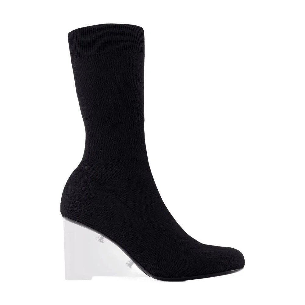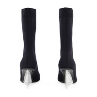 Black stretch Shard boots from Alexander McQueen featuring stretch fit, mid ankle length, round toe, sculpture heel with plexiglass and Seal logo detail. Size Type: WOMEN SHOES IT Heel height 10.5 cm Gender: Women Material: COVER 100% LE SOLE 100% ELASTANE Color: BLACK Made in: IT Product ID: 745220W4WE01000 *Import tax/duty will be calculated at checkout (If applicable)