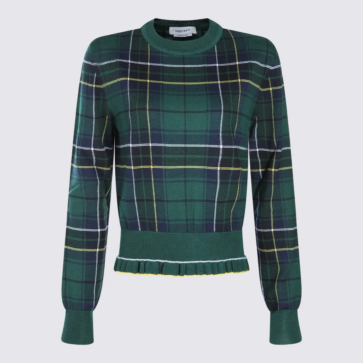 Dark green wool knitwear from McQueen featuring round collar, ribbed cuffs and hem and all over check motif. Size Type: AMERICA Gender: Women Material: 100%WOOL Color: NAVY/GREEN/YELLOW Made in: Italy Product ID: 839787Q1BEL3072 *Import tax/duty will be calculated at checkout (If applicable)