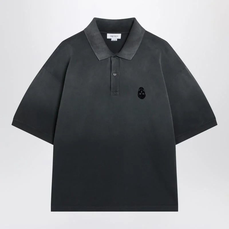 Black cotton polo by Alexander McQueen with a gradient effect, featuring short sleeves, buttons on the front, and a logo on the chest. Gender: Men Material: Fabric I: 100% Cotton / Embroidery: 100% Polyamide Color: Black Made in: Italy Product ID: 824867QXACD/Q_ALEXQ-1000 *Import tax/duty will be calculated at checkout (If applicable)