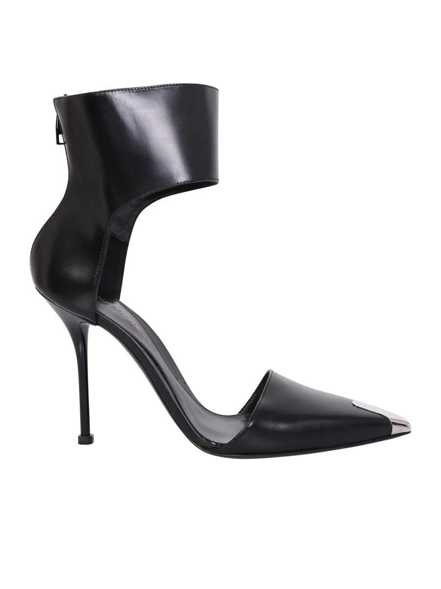 Harness Punk high heel shoes by Alexander McQueen. With a rebellious and daring character, they have an innovative design and in line with the brand identity Pointed toe. Metal toe. Ankle strap. Rear zip fastening. Stiletto heel. Tone on tone sole. Silver tone hardware. Color: black Heel: 10.5 cm Made in Italy Material: 100% Calf Leather Product code: 182460 Brand code: 718859 WHSWD 1081 Gender: Women Material: 100% CALF LEATHER Color: BLACK Made in: IT Product ID: 718859 WHSWD 1081 *Import tax/duty will be calculated at checkout (If applicable)