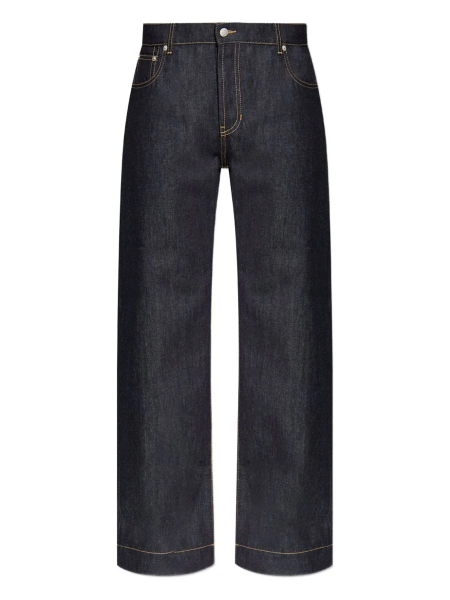 Indigo wide-leg jeans by Alexander McQueen in denim, featuring five-pocket styling, contrast stitching, and a front button and zip closure - Alexander McQueen - Wide-leg jeans - Indigo - Five-pocket styling - Contrast stitching - Front button and zip closure Gender: Men Material: .100% COTTON Color: BLUE Made in: Italy Product ID: 839142 QYAAB 4244 *Import tax/duty will be calculated at checkout (If applicable)