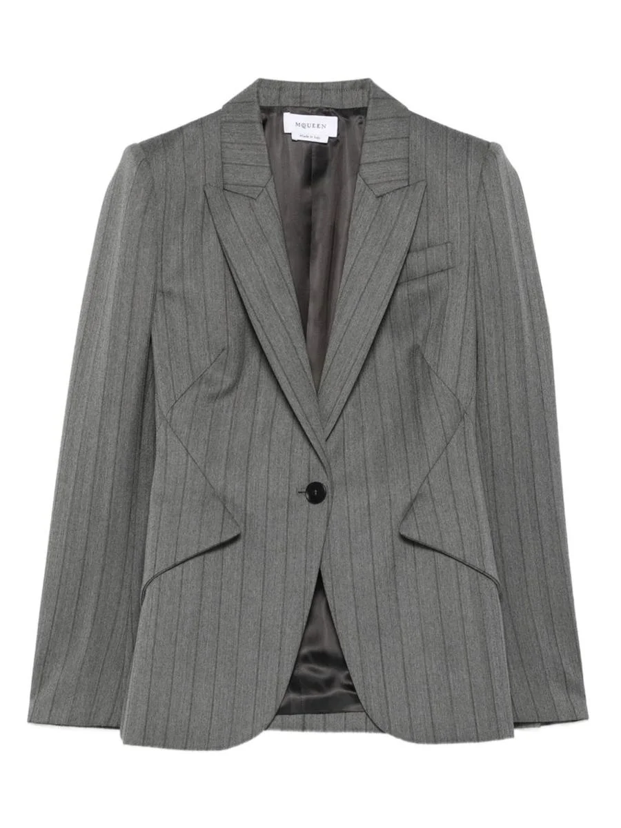 Fitted single-breasted jacket in grey herringbone stripe suiting. Peak lapels, side flap pockets and single button fastening. Finished with a T-bar chain back detail. Product details - Peak lapels - Side flap pockets - Single button fastening - Product code: 839134QJAFE1121 - Made in Italy - Material: 100% Wool
