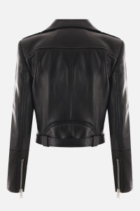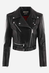 Alexander McQueen's cropped biker jacket crafted in black nappa. Featuring wide lapel, off-centre zip closure, tabs at shoulders, long sleeves with zip-up at cuffs, zip details and straight hem with removable belt. Lined interior. Gender: Women Color: Black Made in: IT Product ID: 668451Q5AJF1000 *Import tax/duty will be calculated at checkout (If applicable)