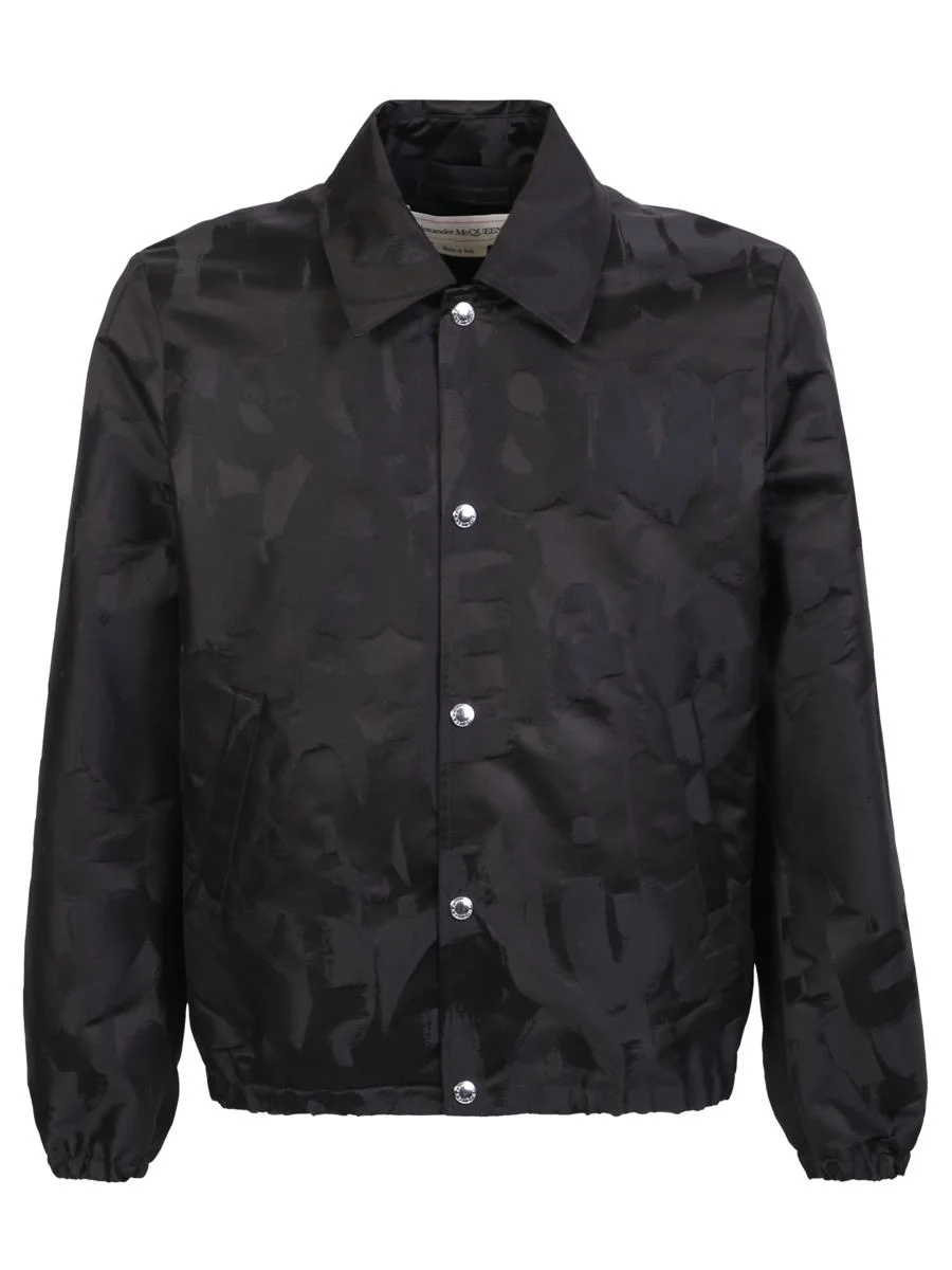 Jacket closure with snap buttons, pattern with Graffiti tonal logo , two welt pockets and ribbed trim on the hem and cuffs by Alexander McQueen Snap closure. Graffiti logo tonal pattern. Two welt pockets. Ribbed hem and cuffs. Color: Black. Material: 100% Polyester Gender: Men Material: 100% POLYESTER Color: Black Made in: Imported Product ID: 726909 QUR22 1011 *Import tax/duty will be calculated at checkout (If applicable)