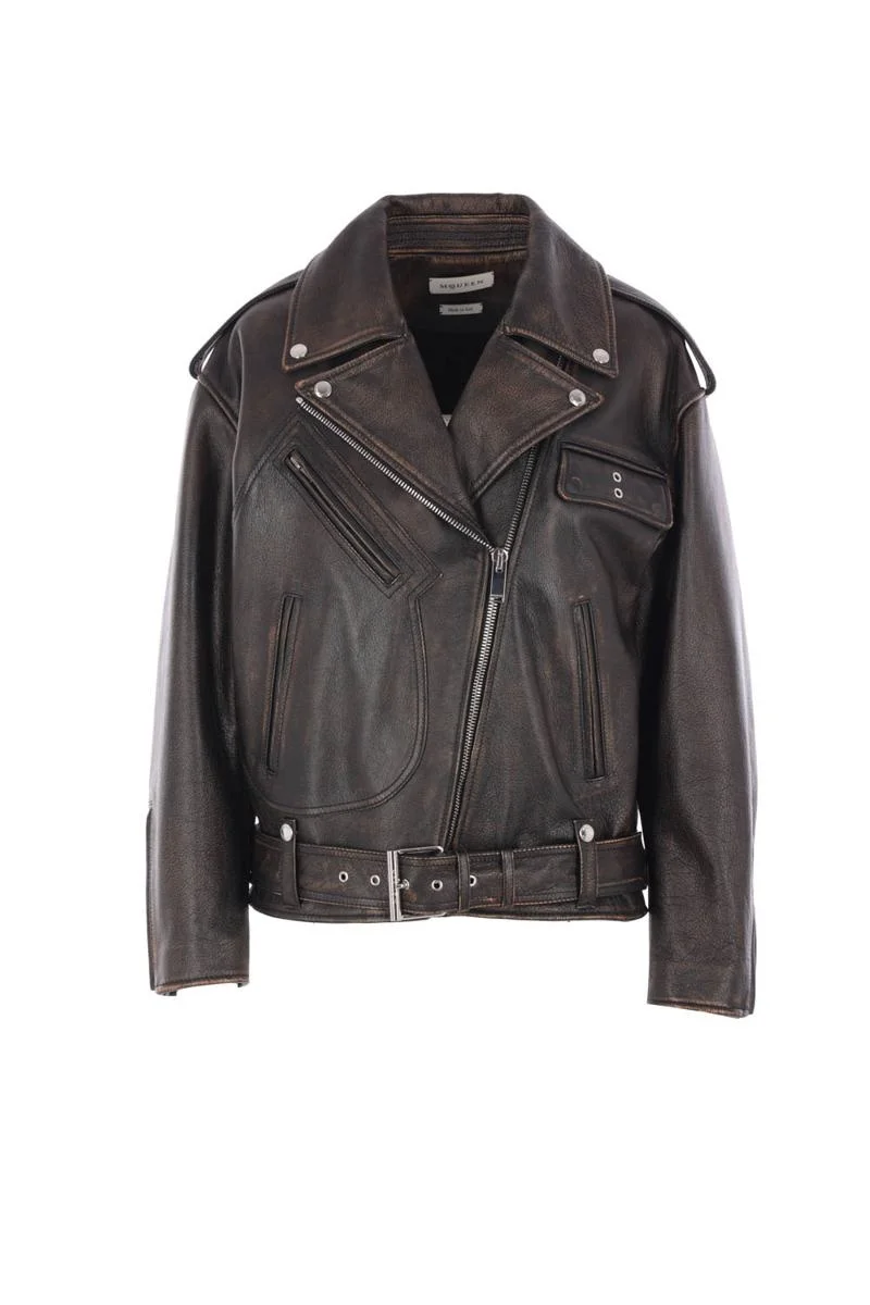 Alexander McQueen oversize biker jacket crafted from dark brown grained leather with an antique finish. It features a biker collar, an off-center zip closure, multiple pockets, long sleeves with zipped cuffs, shoulder epaulettes, a waist belt, and a lined interior. Gender: Women Material: L COWHIDE 100% Color: Brown Made in: IT Product ID: 833758Q5APD2122 *Import tax/duty will be calculated at checkout (If applicable)