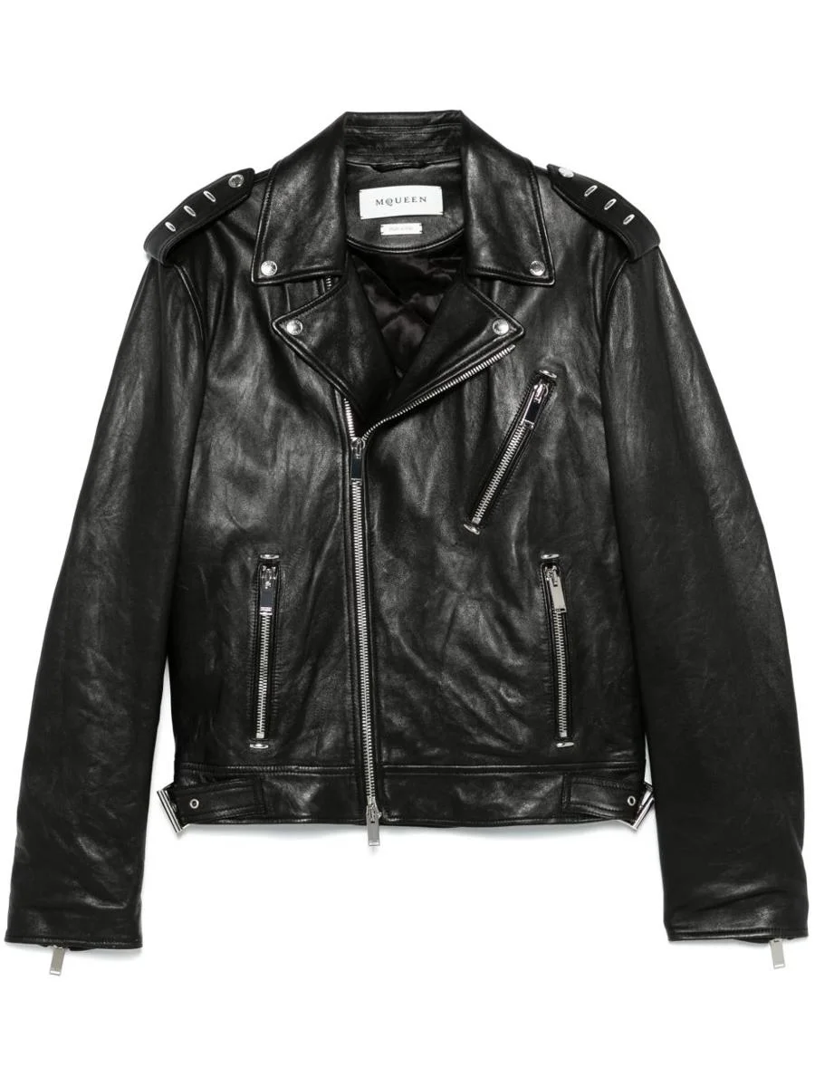 Alexander McQueen biker jacketr made of black nappa leather. Featuring a biker collar, asymmetrical double-zip closure, multiple pockets, long sleeves with zippered cuffs, shoulder epaulets with studs, a straight hem with adjustable side straps, and a quilted interior. Gender: Men Material: L LAMB LEATHER 100%;ET COWHIDE 100%;I POLYESTER 100%;F VISCOSE 100%;FP COTTON 100% Color: Black Made in: IT Product ID: 817932Q5AOW1000 *Import tax/duty will be calculated at checkout (If applicable)