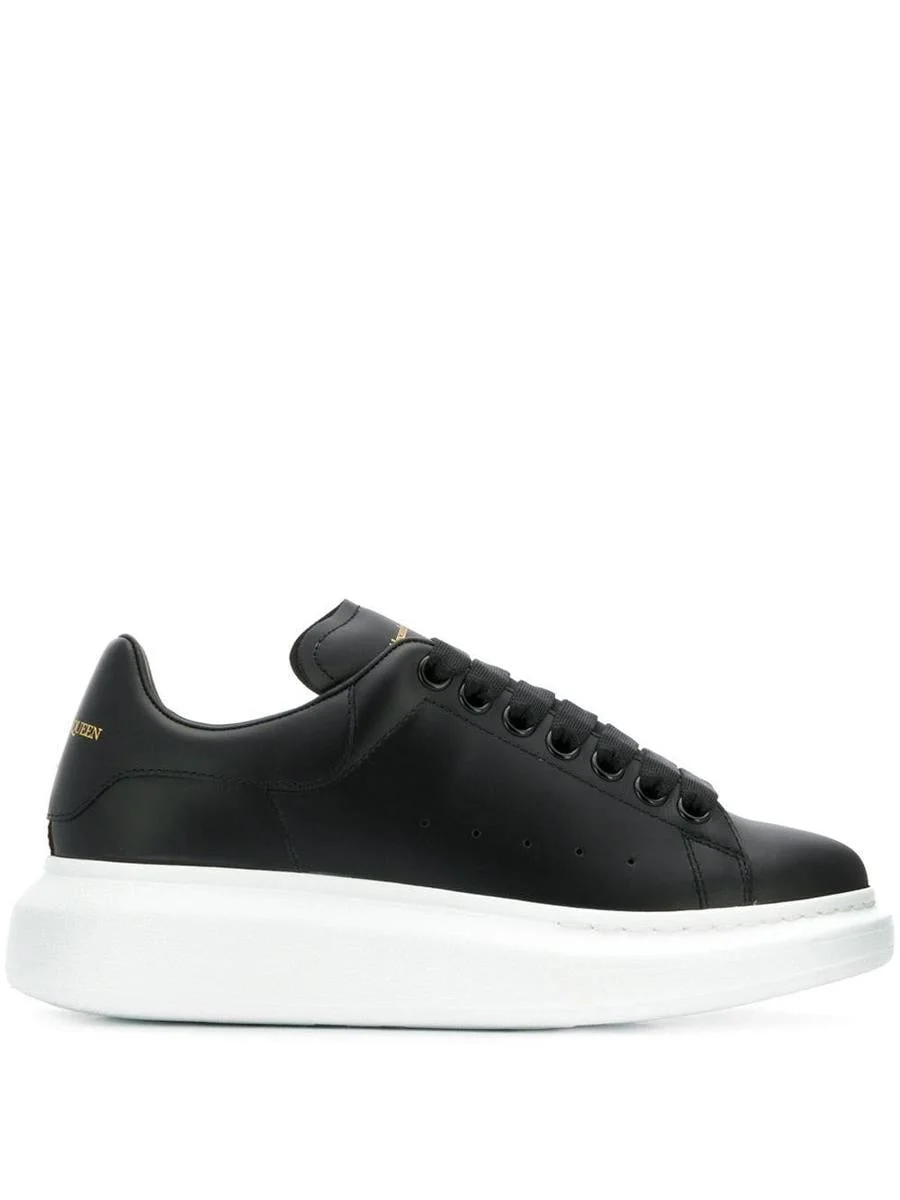Black leather Oversized low-top sneakers from Alexander McQueen featuring branded heel counter, logo-print tongue, round toe, front lace-up fastening and flat rubber sole. To lessen the environmental impact and to reduce cotton consumption, Alexander McQueen will no longer be providing a dust bag with its sneakers.. Heel 1,8 in / 4,5 cm; Platform 1,3 in / 3,2 cm Gender: Women Material: SOLE: RUBBER 100% LINING: CALF LEATHER 100% OUTER: CALF LEATHER 100% Color: BLACK Made in: IT Product ID: 553770WHGP01000 *Import tax/duty will be calculated at checkout (If applicable)