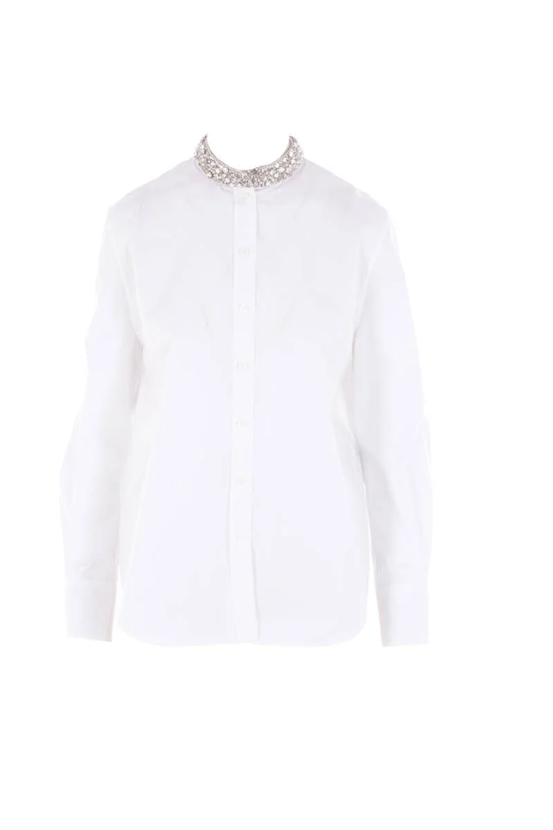 Alexander McQueen shirt made of white cotton poplin. Featuring a mandarin collar with crystal embroidery, front button closure, long sleeves with buttoned cuffs, and a rounded hem. Gender: Women Material: 100% COTTON Color: WHITE Made in: Italy Product ID: 838926QAABT9000 *Import tax/duty will be calculated at checkout (If applicable)