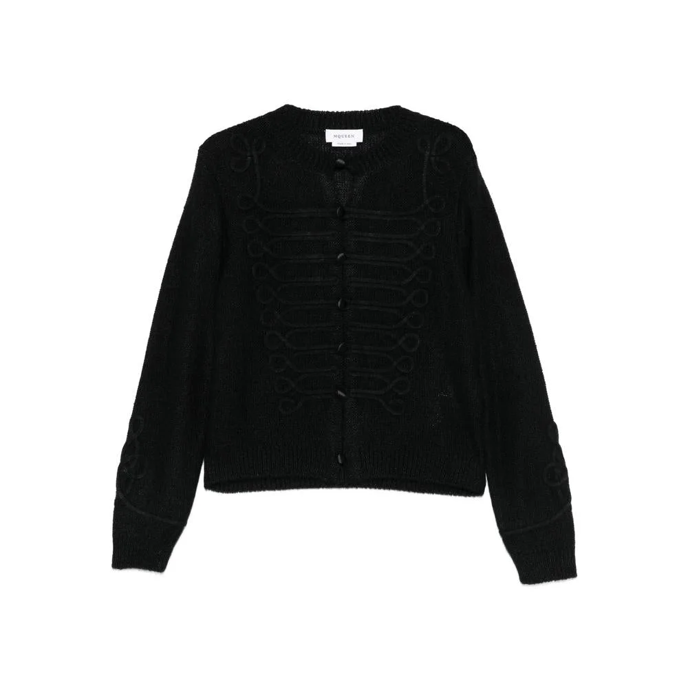 Black braided embellishment button front round neck long sleeves knitted fabric Gender: Men Material: NYLON: 31.0%, VISCOSE: 52.0%, MOHAIR: 16.0%, WOOL: 1.0% Color: Black Made in: Imported Product ID: 849709 Q1BFJ 1000 *Import tax/duty will be calculated at checkout (If applicable)