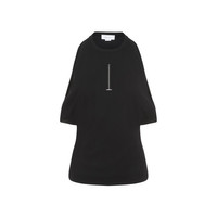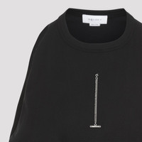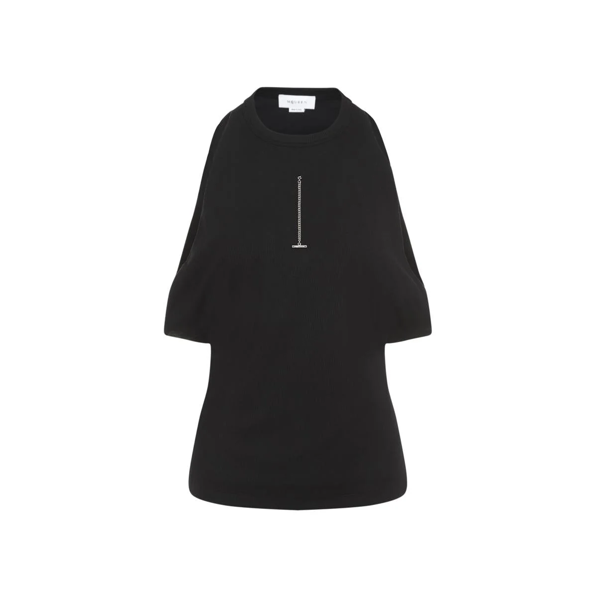 Alexander McQueen Black Cotton Top. Black ribbed stretch cotton, round neckline, sleeveless with draped low-cut armholes, silver-tone metal chain with cross-bar detail on the front, straight hem. Gender: Women Material: 97%COTTON 3%ELASTANE Color: Black Made in: IT Product ID: 804191.QLADW_1000 *Import tax/duty will be calculated at checkout (If applicable)