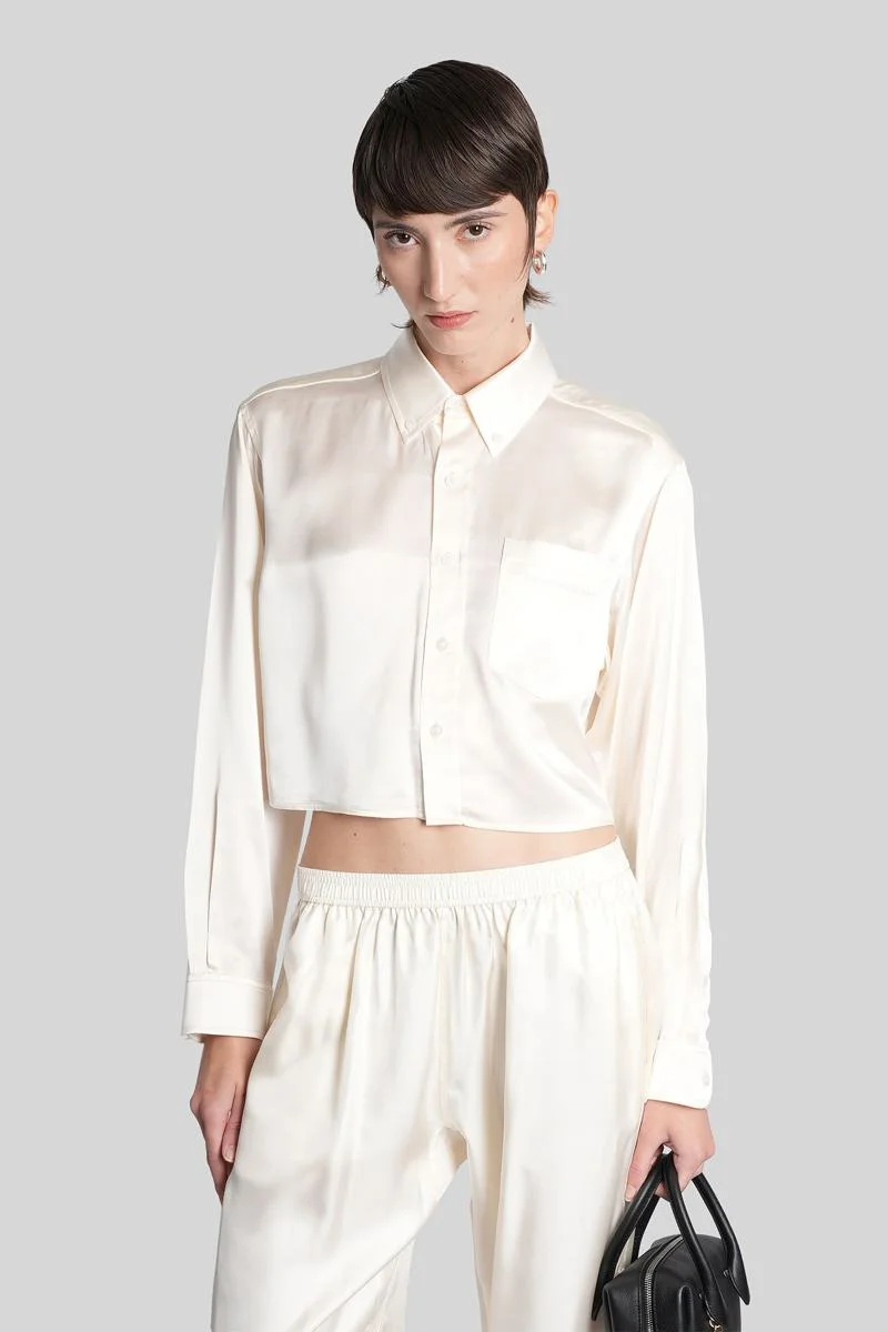 Shirt in beige silk, collar, frontal buttoning, long sleeves, front pocket, embroidery front logo, crop cut, 100% silk, Made in China Gender: Women Material: SILK Color: Beige Made in: Imported Product ID: 429389_4WC4251161 *Import tax/duty will be calculated at checkout (If applicable)