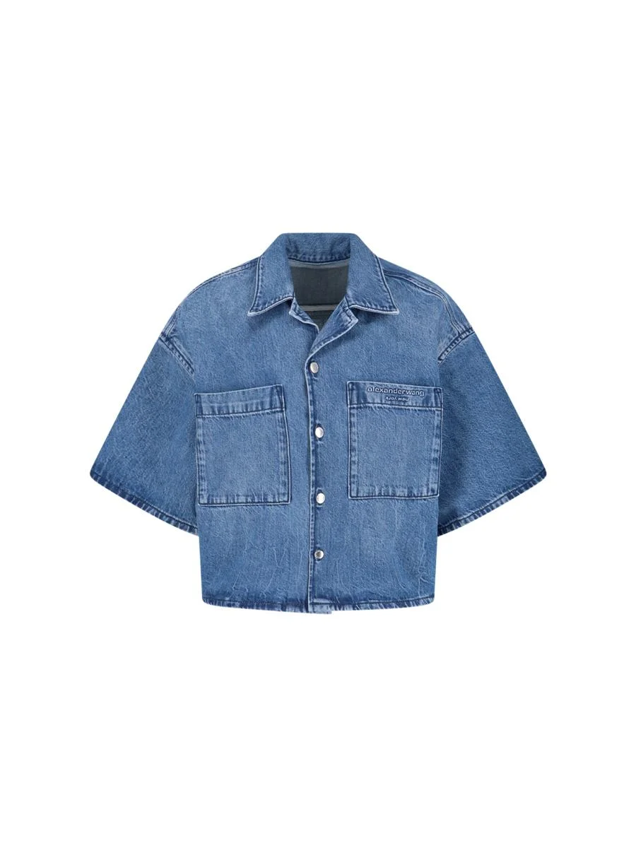Vintage marbled blue lightweight denim cut into a cropped, boxy short sleeve shirt. Finished with a front button closure and logo-embossed chest pocket. - Vintage Marbled Blue - Embossed logo - Body Composition: 100% cotton. - Model is 5'11" and Wears a Size S - Made in Turkey - 4DC1261938400C composition Body: 100% COTTON