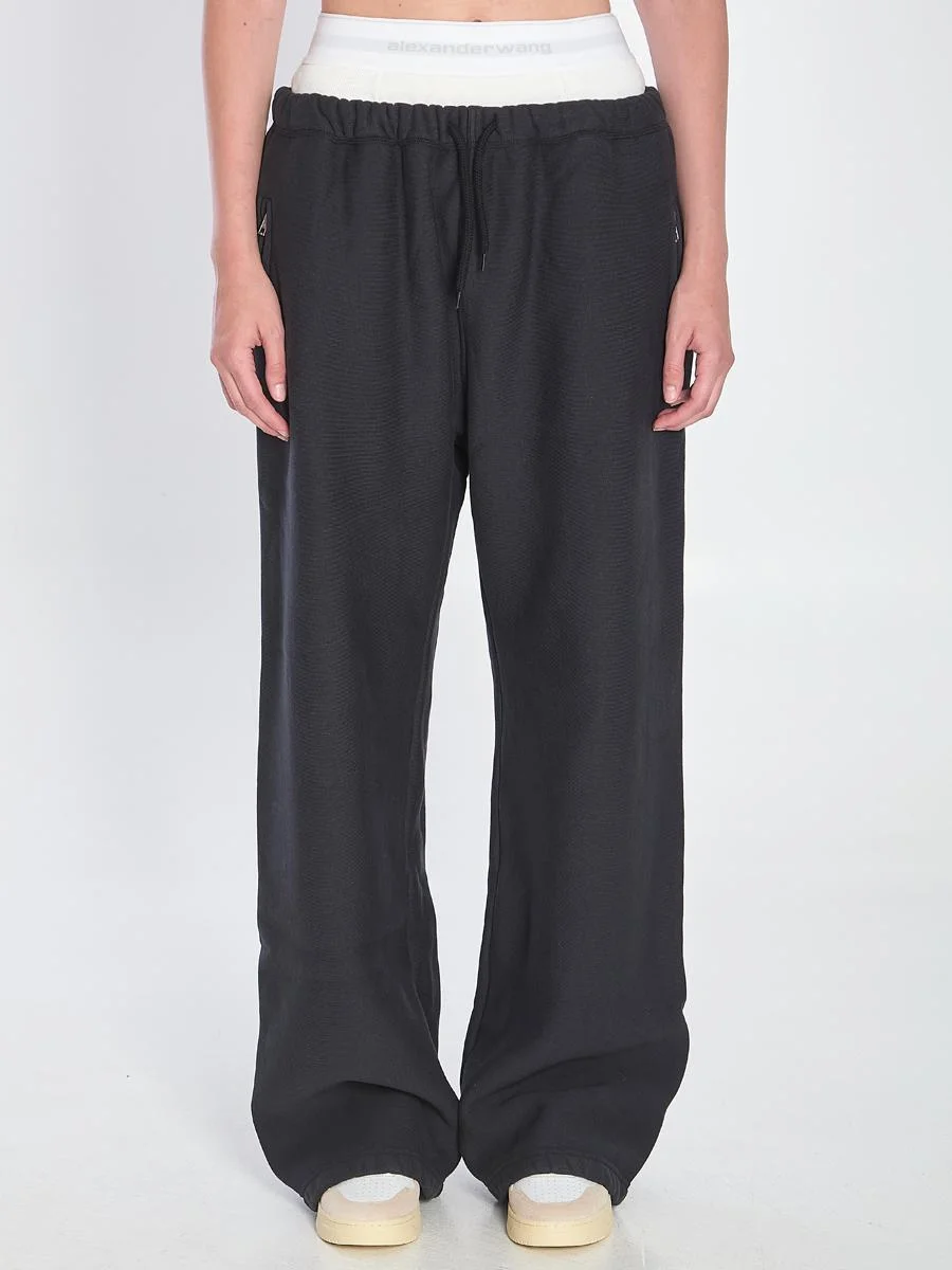 Wide-leg sweatpants in black cotton terry with pre-styled brief featuring Alexander Wang logo elastic trim. It features drawstring at waist and two side zip pockets. Relaxed fit. The model is 179 tall and wears size S Size nationality: INT Gender: Women Material: 100% COTTON Color: Black Made in: Imported Product ID: 7283478 4CC1244349 020A *Import tax/duty will be calculated at checkout (If applicable)