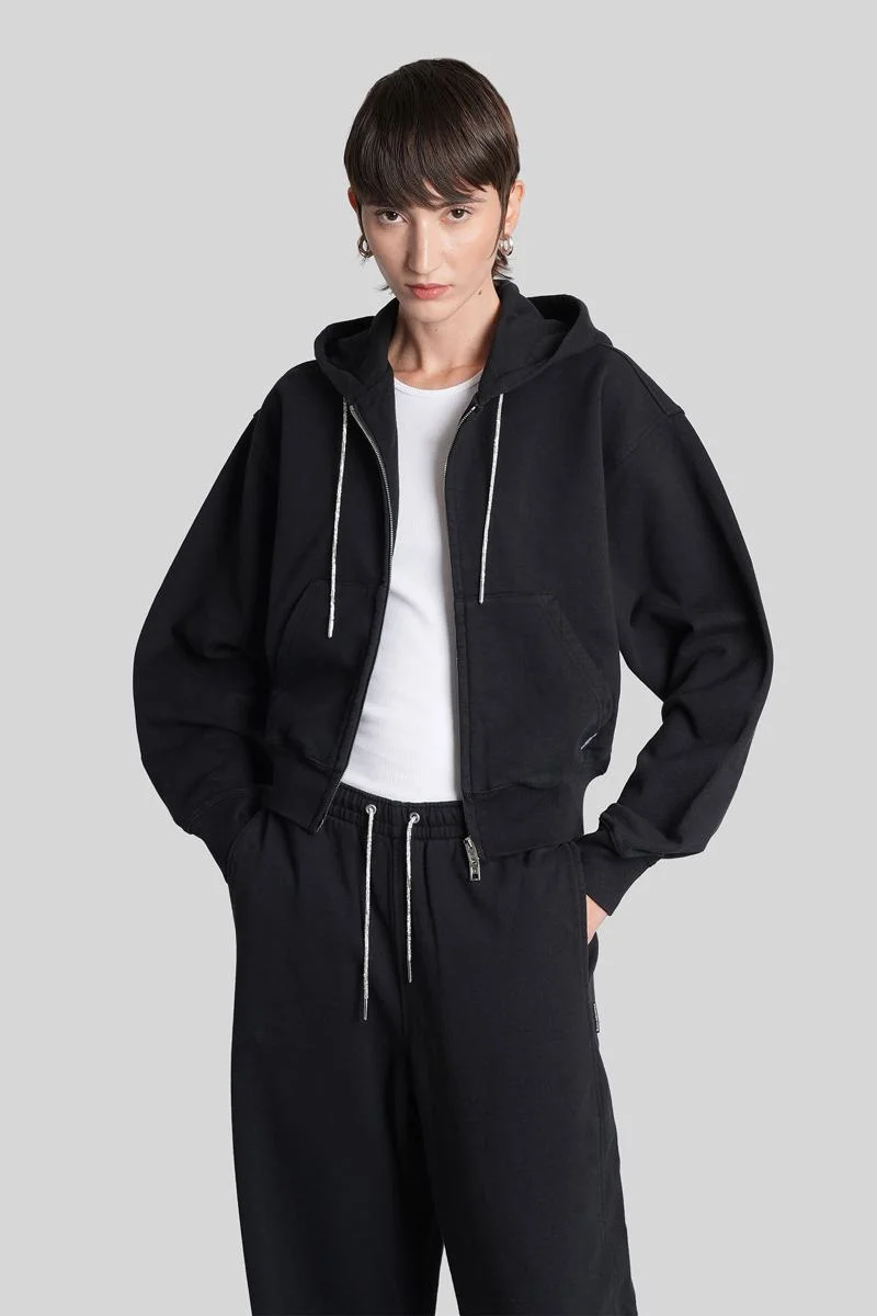 Black Cotton Terry Hoodie with Crystal Hotfix Drawcord