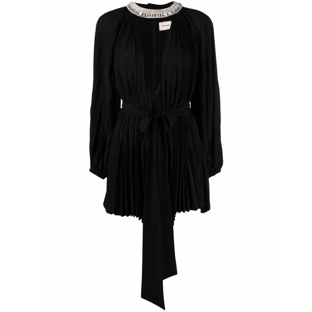 Black glass crystal embellishment plunging v-neck fully pleated tied waist asymmetric hem thigh-length Gender: Women Material: POLYESTER: 100.0%, BRASS: 100.0%, GLASS: 100.0% Color: BLACK Made in: PT Product ID: 222DR1689B BLACK *Import tax/duty will be calculated at checkout (If applicable)
