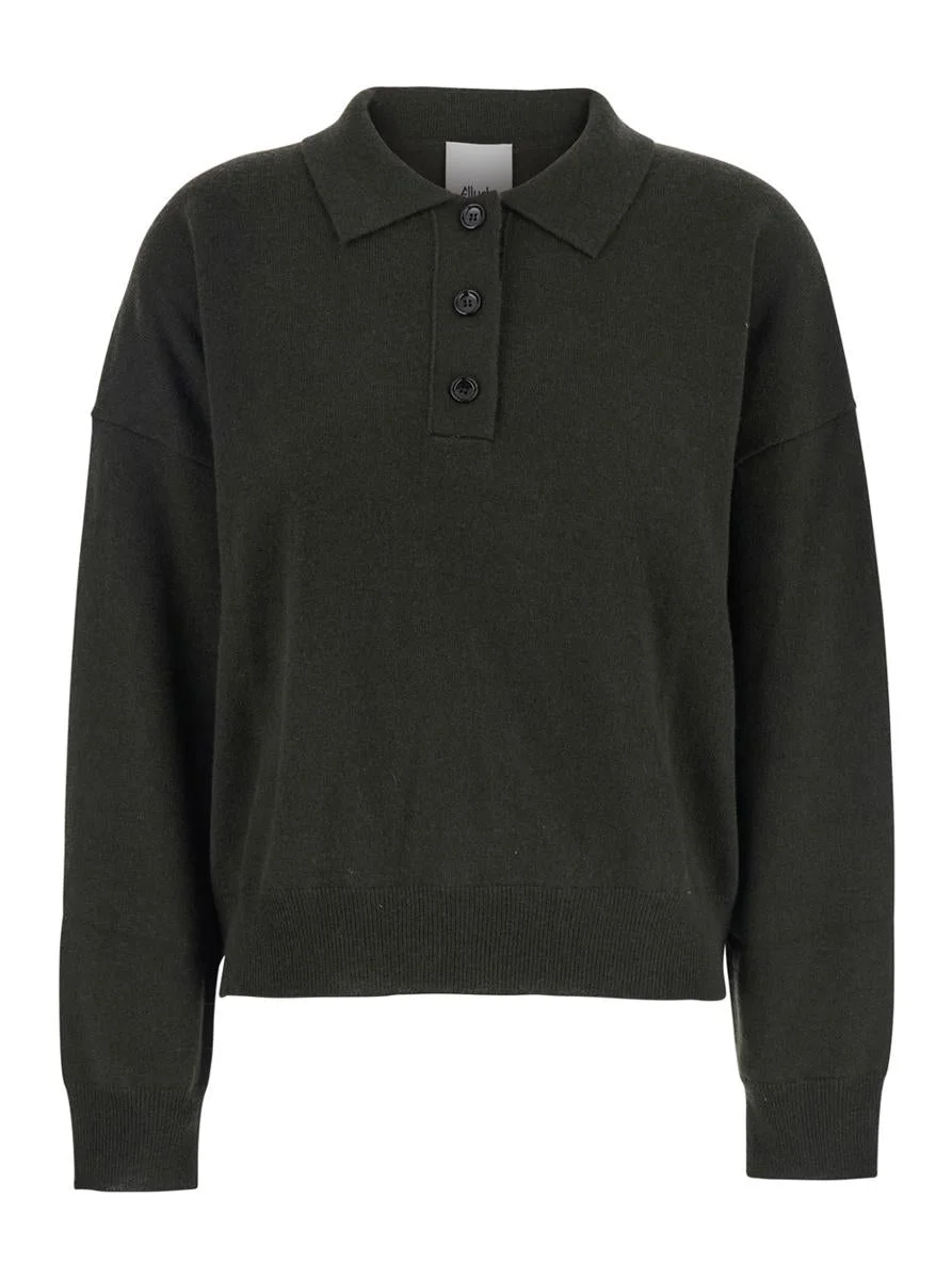 Allude Green Polo Shirt With Classic Collar And Ribbed Trims In Wool Woman