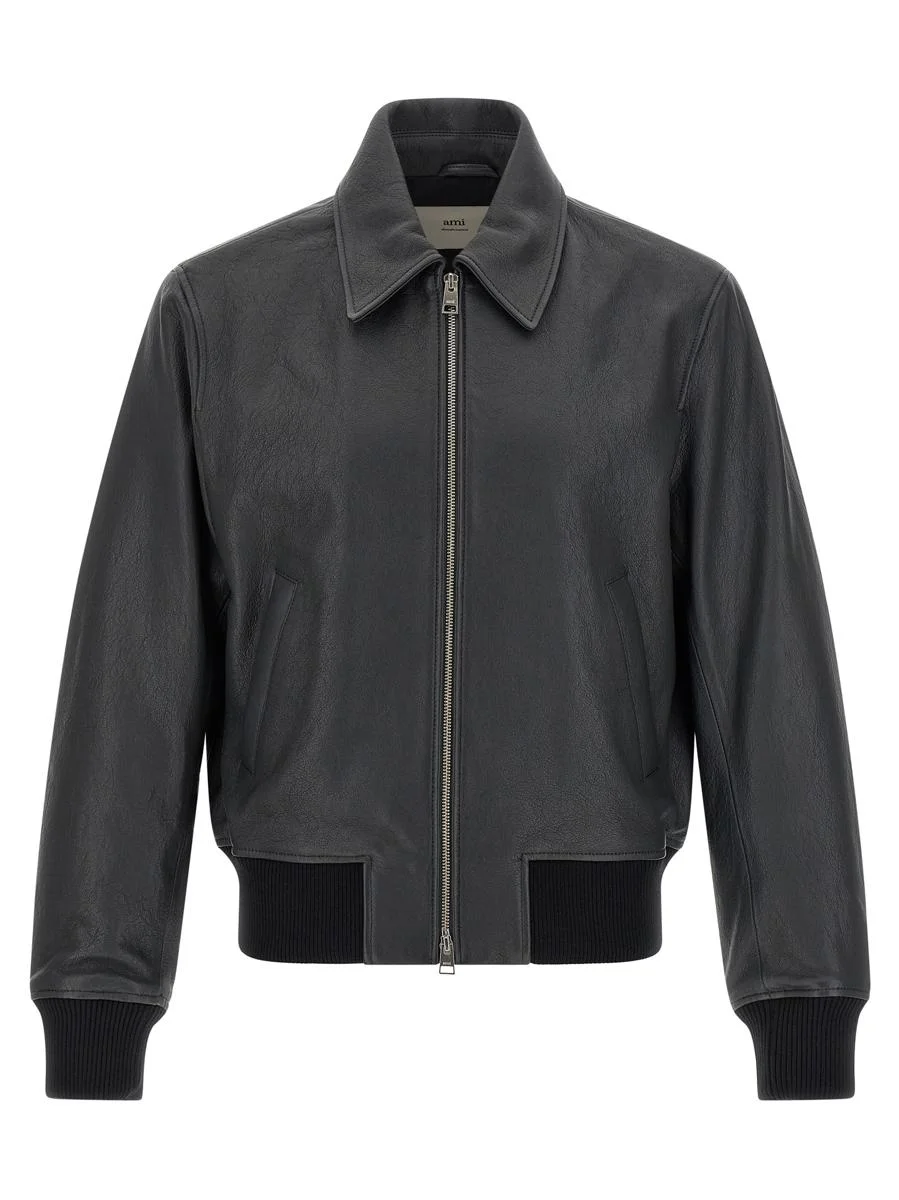 Smooth lambskin bomber jacket with stretch ribbed knit details, embossed 'Ami de Coeur' logo on the back, pointed collar, front zip closure, pockets, long cuffed sleeves, cotton lining Gender: Men Material: 100% LAMB LEATHER (OVIS ARIES) Color: GRAY Made in: Imported Product ID: HJK850LH0044020 *Import tax/duty will be calculated at checkout (If applicable)
