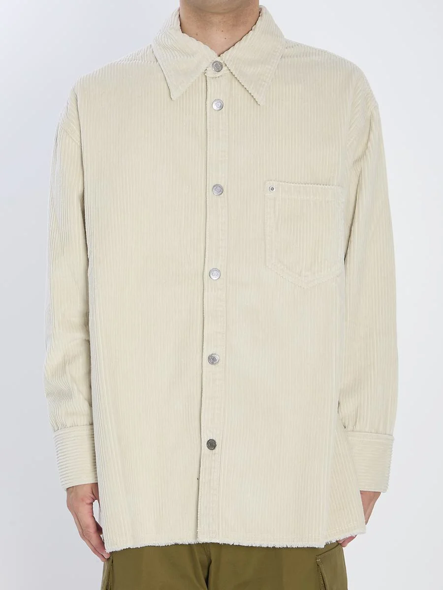 Overshirt in ivory corduroy cotton. Features a pointed collar, front closure with branded buttons, one patch pocket on the chest, long sleeves, buttoned cuffs, side slits at the hem, raw-cut hem, and a logo patch on the back. Oversized fit. The model is 189 cm tall and wears size M. Size nationality: INT Gender: Men Material: 100% COTTON Color: WHITE Made in: Portugal Product ID: 1847271 USH793 CO0131 185 *Import tax/duty will be calculated at checkout (If applicable)