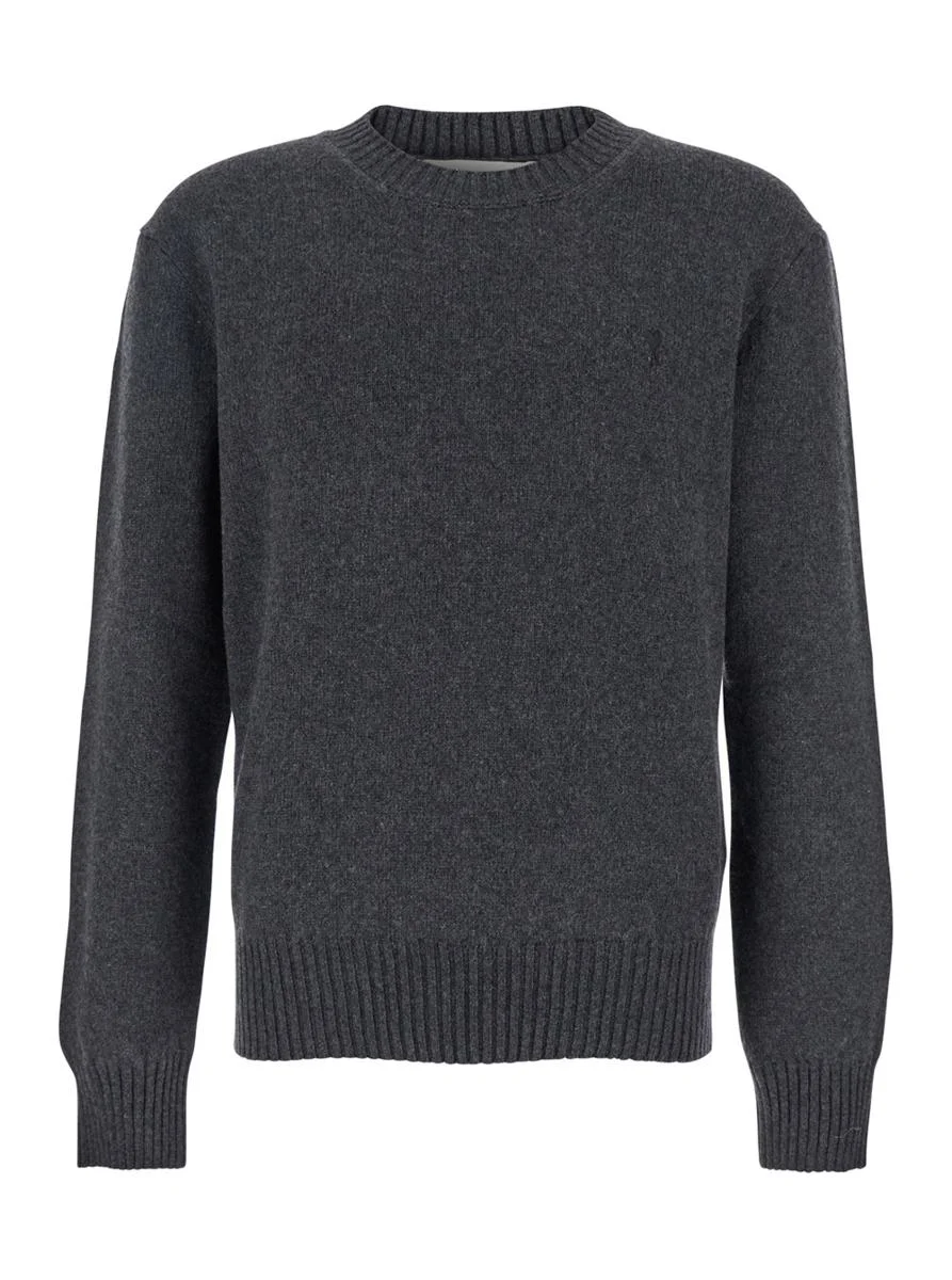 AMI Paris Grey Crew-Neck Sweater With Ribbed Trims In Cashmere Man