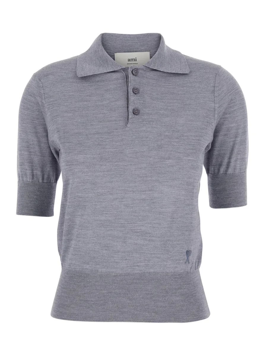 AMI Paris Grey Polo Shirt With Classic Collar And Logo Embroidery On The Front In Wool And Silk Woma