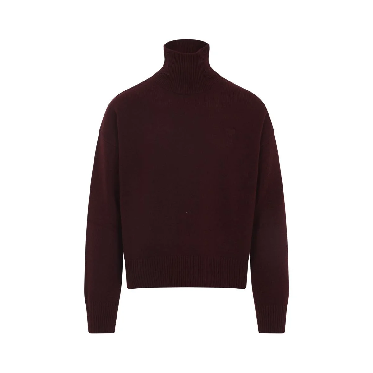 Ami ADC Red Wool Sweater. Dark red wool and cashmere, standing collar, embroidered logo on the breast, dropped shoulders, long sleeves, straight hem, ribbed edges. Gender: Men Material: 90%WOOL 10%CASHMERE Color: RED Made in: Portugal Product ID: UKS821.KN0071_692 *Import tax/duty will be calculated at checkout (If applicable)
