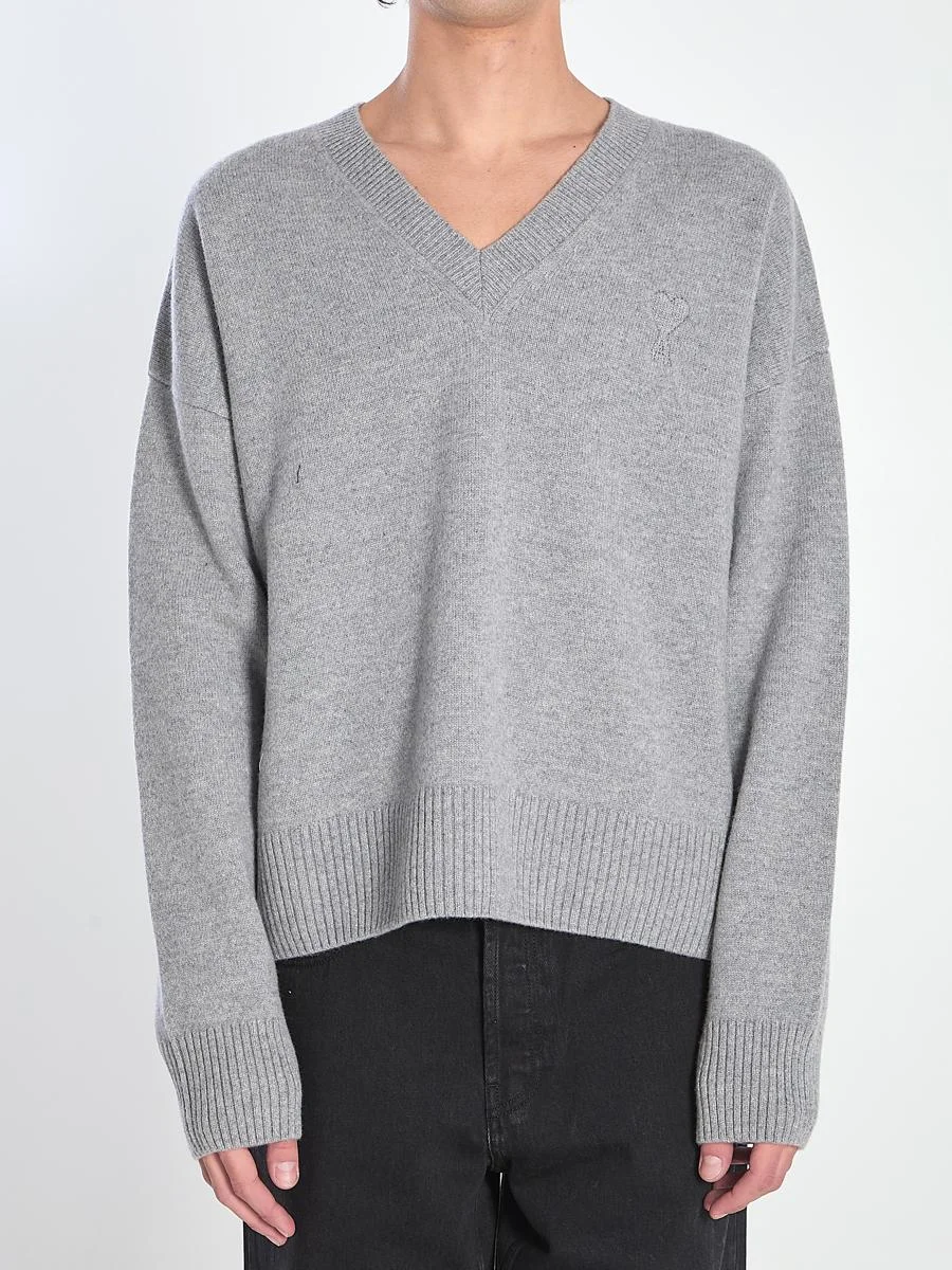 Sweater in grey wool and cashmere blend. Features long sleeves, V-neckline, ribbed collar, hem and cuffs, and tone-on-tone Ami de Coeur logo on the left chest. Regular fit. The model is 186 cm tall and wears size L. Size nationality: INT Gender: Men Material: 90% WOOL, 10% CASHMERE Color: GREY Made in: Italy Product ID: 1484636 UKS820 KN0071 050 *Import tax/duty will be calculated at checkout (If applicable)