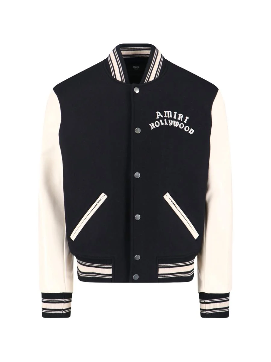 Hollywood Logo-Embroidered Leather and Wool-Blend Flannel Varsity Jacket Black