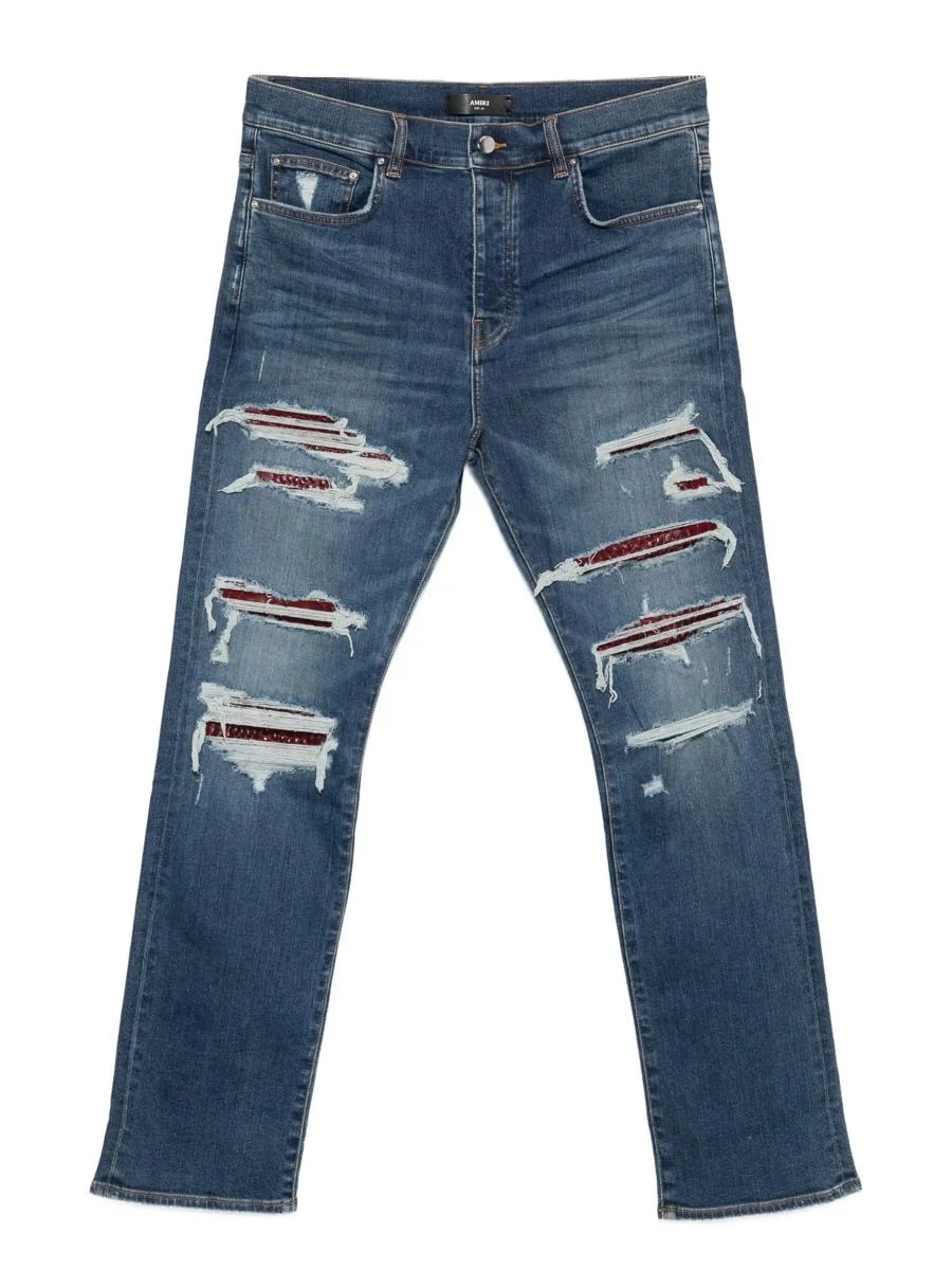 Thrasher Slim-Fit Distressed Croc-Effect Leather-Trimmed Panelled Jeans Blue
