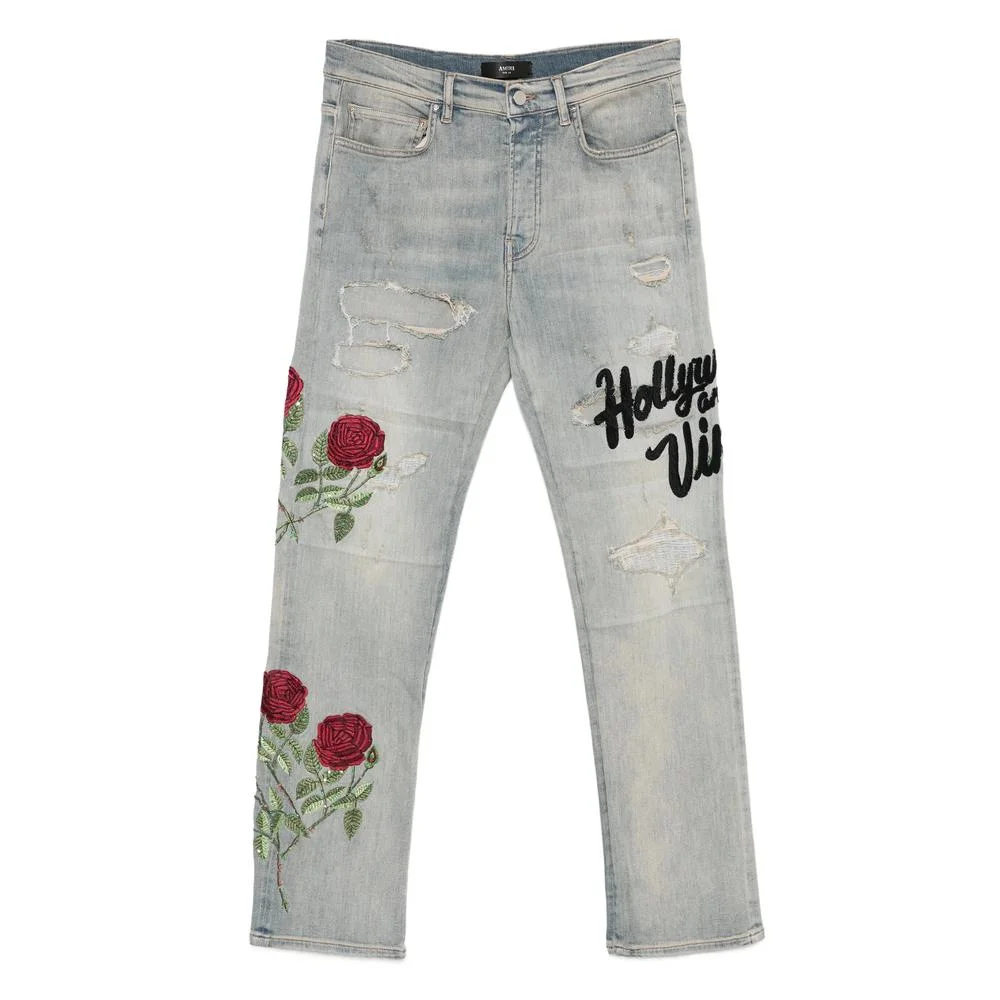 Light blue distressed detailing embroidered roses sequin embellishments faded wash five pockets belt loops Gender: Men Material: COTTON: 92.0%, ELASTANE: 2.0%, ELASTOMULTIESTER: 6.0% Color: BLUE Made in: Italy Product ID: AMDNSM1021 AINDI *Import tax/duty will be calculated at checkout (If applicable)