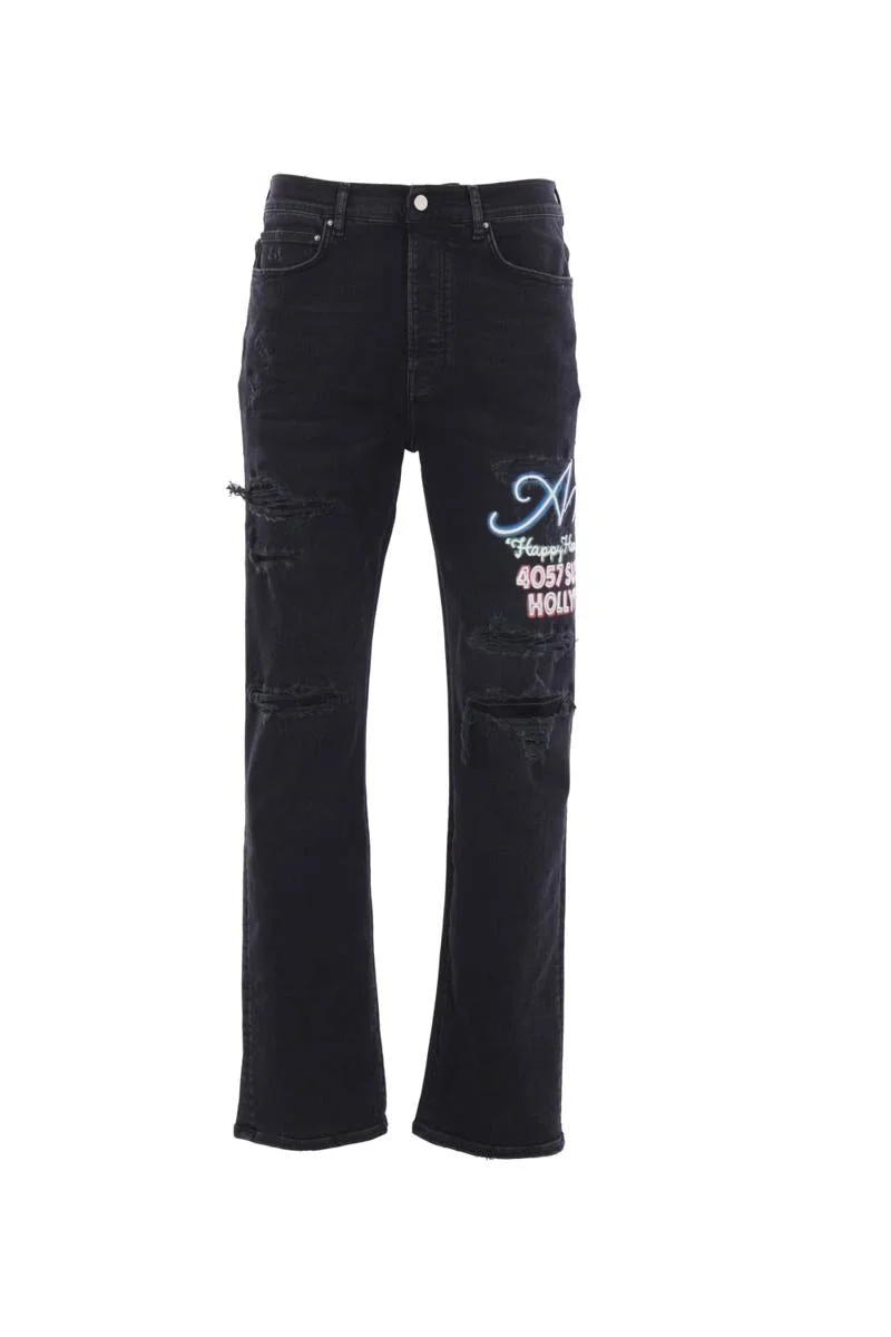 Amiri slim-fit jeans crafted from black washed stretch cotton denim with a distressed finish, rips, and Amiri Neon Lights embroidery/print. Featuring a front fastening with metal buttons, belt loops, and the classic five-pocket construction. Finished with an embossed leather logo patch on the back. Gender: Men Material: 92% COTTON 6% ELASTOMULTIESTER 2% ELASTANE Color: DUSK BLACK Made in: Italy Product ID: AMDNSM1019635 *Import tax/duty will be calculated at checkout (If applicable)