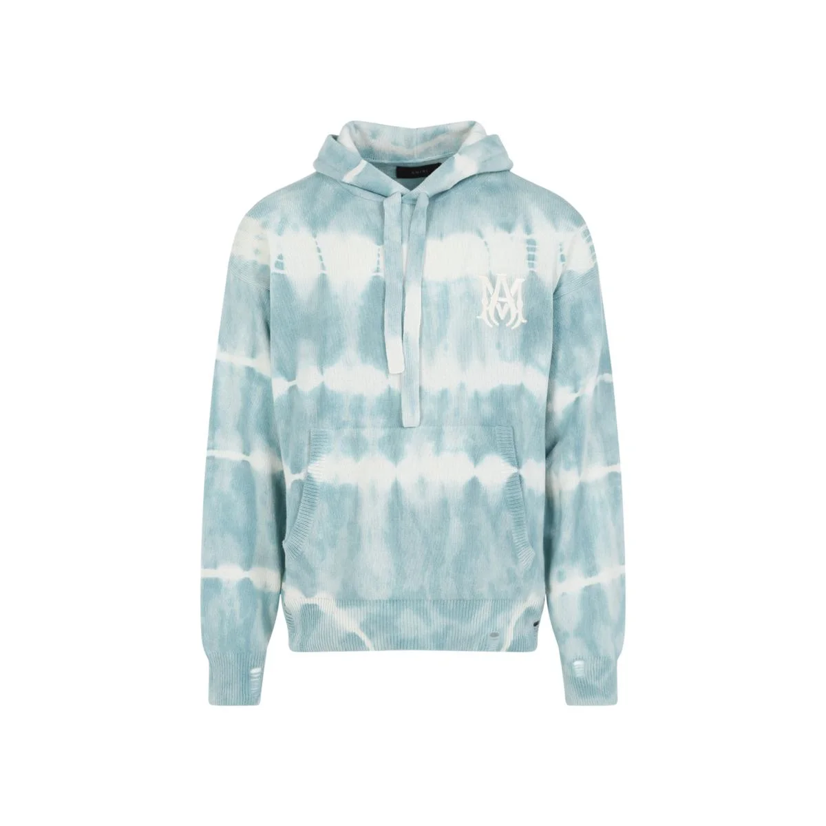 Amiri Sea Blue Eco Cashmere Ma Tie Dye Hoodie. Pure sea blue eco cashmere hoodie, tonal hood, front drawstring details, embroidered contrasting white signature logo on the chest, kangaroo pockets, long sleeves, ribbed cuffs and hem, straight hem, overused effect. Gender: Men Material: 100%ECO CASHMERE Color: BLUE Made in: IT Product ID: AMKNHD1006_ *Import tax/duty will be calculated at checkout (If applicable)