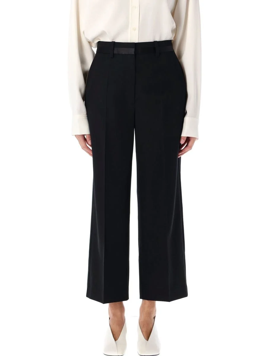 Wool Louisa trousers by Anine Bing. Featuring: Tuxedo pant style Concealed hook and zip fly Belt loops Inset satin details Pleat crease down the front Side seam pockets Wide leg with a cropped inseam Model is 1,70 m and wears size 36 Gender: Women Material: 100% WOOL LINING 100% POLYESTER Color: Black Made in: IMPORTED Product ID: 25PA0310305BLK26#BLACK *Import tax/duty will be calculated at checkout (If applicable)