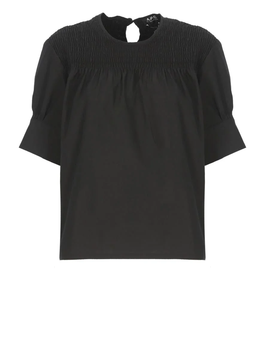 - Blue A.P.C. cotton blouse for woman - Elastic round neck with rear button - Short sleeves with buttons Model's height is 179 cm and she wears a size S Gender: Women Material: 100% COTTON Color: Black Made in: Imported Product ID: COEVD-F13445LZZ *Import tax/duty will be calculated at checkout (If applicable)
