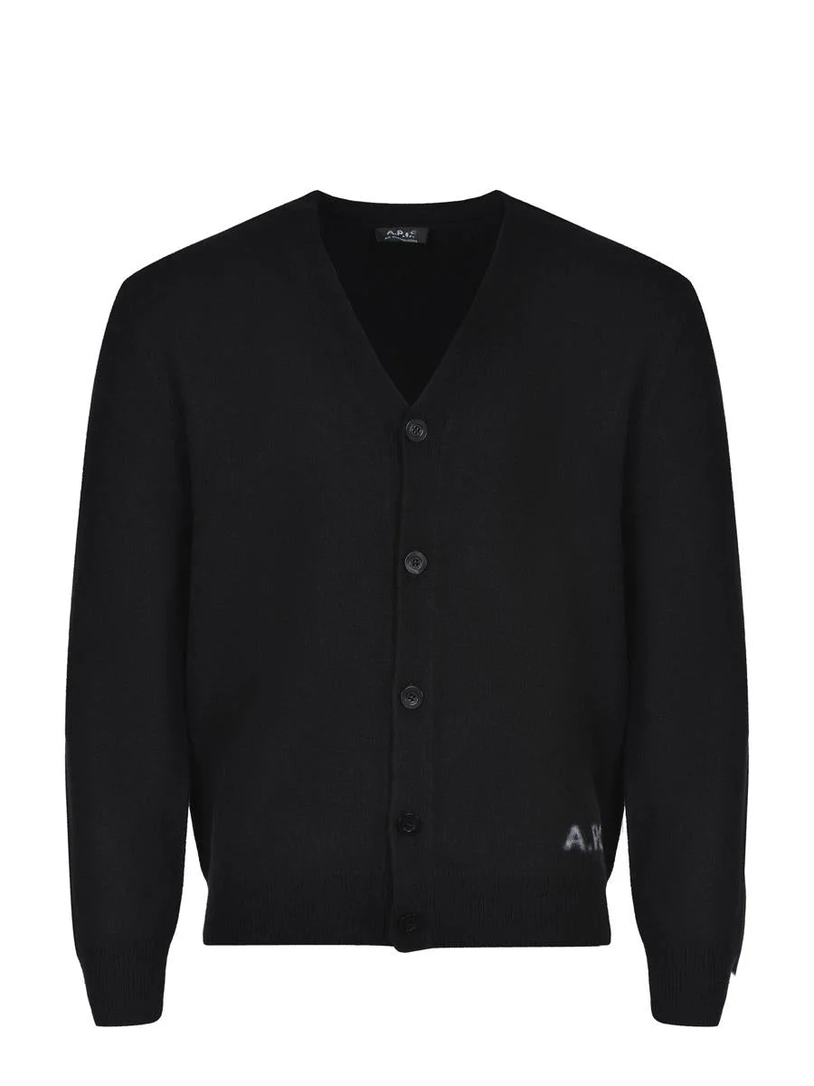 A.P.C. "Kenny" cardigan made of black wool. V-neck. Front button closure. Long sleeves. Contrasting A.P.C. logo lettering. Gender: Men Material: WOOL Color: Black Made in: Imported Product ID: WVBDK-H22305LZZ *Import tax/duty will be calculated at checkout (If applicable)