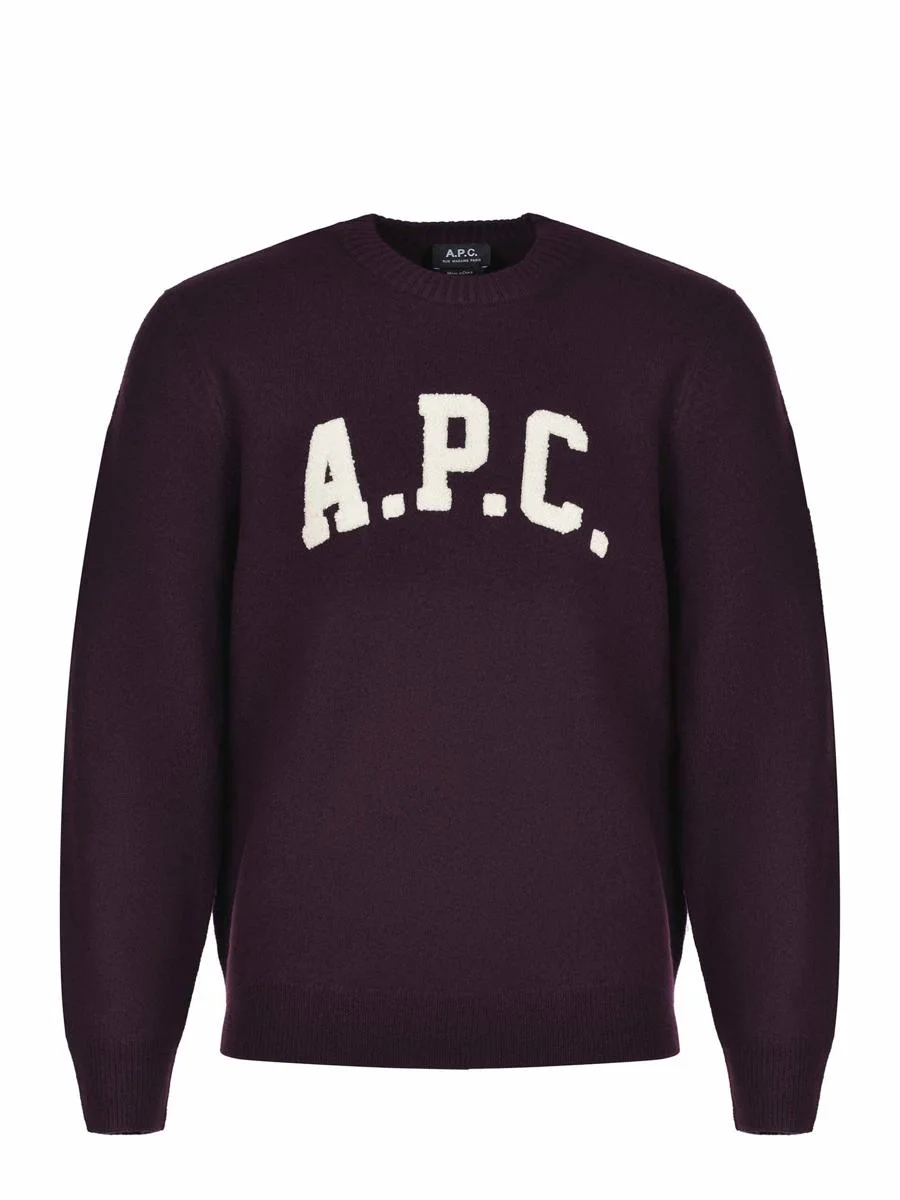 A.P.C. "Jay" sweater made of soft virgin wool in Plum color. Ribbed crew neck. Long sleeves. Contrasting white "A.P.C." logo lettering on the chest. Straight cut. Gender: Men Material: WOOL Color: PRUNE Made in: Imported Product ID: WVBDK-H23458GAC *Import tax/duty will be calculated at checkout (If applicable)