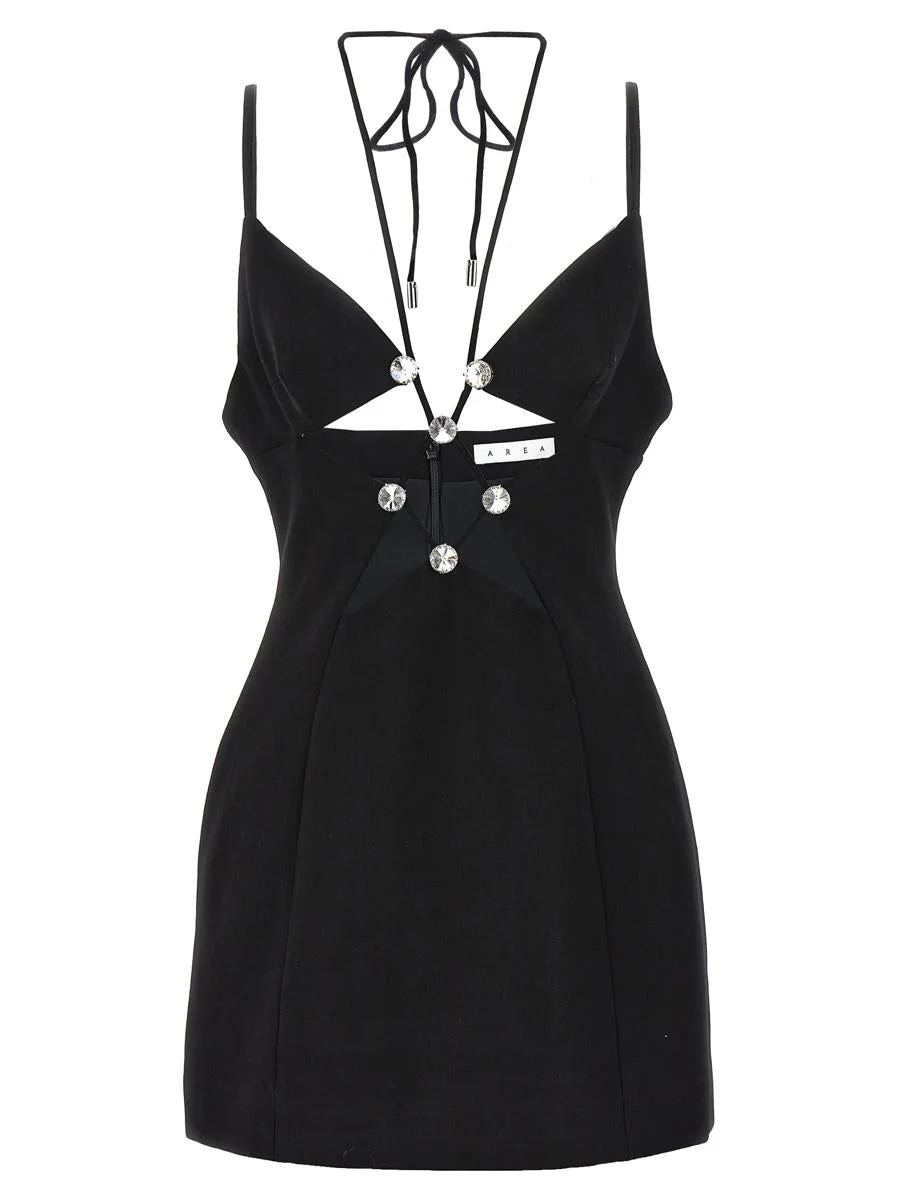 'Star Cut Out' dress with cut-out details and front rhinestone applique, neck fastening, thin straps, and back zip closure Gender: Women Material: 67% RAYON 28% NYLON 5% ELASTANE Color: Black Made in: Imported Product ID: 2401D22184BLACK *Import tax/duty will be calculated at checkout (If applicable)