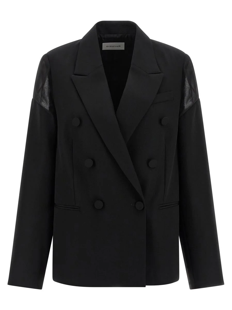 'Sveva' mid-weight virgin wool blazer with semi-transparent tulle inserts on the shoulders, double-breasted style with front button closure, peak lapels, chest pocket, patch pockets, long sleeves, cupro lining Gender: Women Material: 100% VIRGIN WOOL Color: Black Made in: Italy Product ID: ARMTMB010W022002BLACK *Import tax/duty will be calculated at checkout (If applicable)