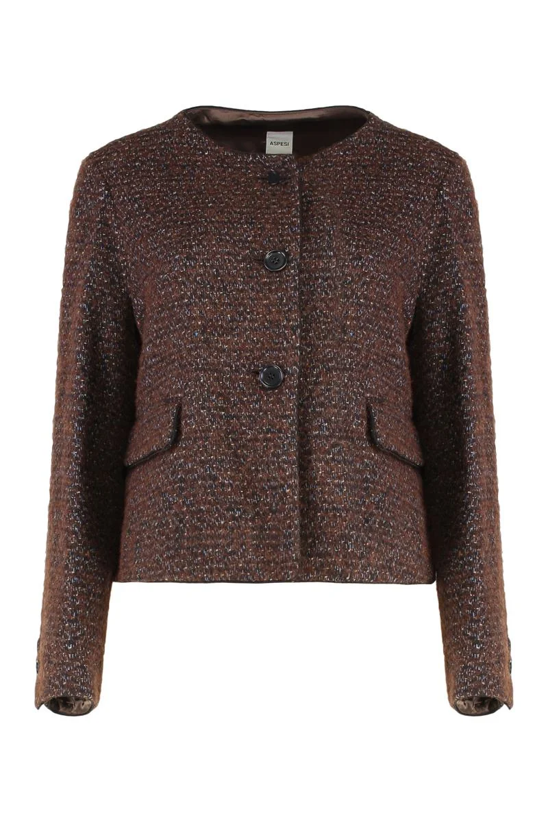 Sweater Jacket with a short cut, made of a soft brown fabric. It features a front closure with buttons and two pockets with flaps, adding functionality. The simple design is complemented by a round collar, giving it an elegant and versatile look, ideal for both casual and more formal combinations. Perfect for the autumn and winter seasons. 30% Acrylic, 26% Cotton, 10% Polyester, 8% Virgin wool, 8% Alpaca wool, 8% Wool, 5% Polyamide, 5% Other fibers Gender: Women Material: ACRYLIC Color: BROWN Made in: Italy Product ID: W3G0926V558V558_01331 *Import tax/duty will be calculated at checkout (If applicable)