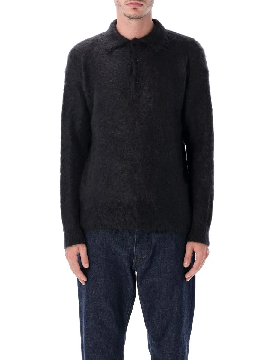 A signature Auralee Autumn/Winter piece, this knit polo is made from luxurious Super Kid Mohair softly twisted around a natural wool core. The result is an exceptionally fluffy, lightweight texture with a silky hand and a subtle sheen. The long, brushed fibers create depth and volume, giving the piece a refined yet effortless feel. Soft Super Kid Mohair with wool core yarn Brushed, fluffy texture with silky sheen Classic long-sleeve Polo collar design with three button placket Relaxed fit silhouette Andrea is 1,90 m and wears size 4 Gender: Men Material: 60% MOHAIR 40% WOOL Color: INK BLACK Made in: Imported Product ID: 25AA25AP01KM#IB *Import tax/duty will be calculated at checkout (If applicable)
