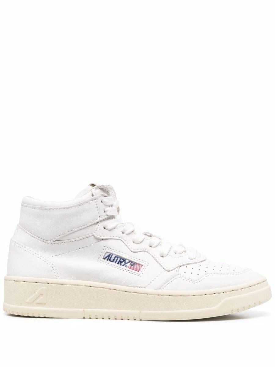 White goatskin Medalist lace-up sneakers from Autry featuring ankle-length, front lace-up fastening, round toe, logo patch to the side, branded leather insole and flat rubber sole. HEEL: 4.0 Centimetres HEIGHT: 8.5 Centimetres Sole height: 3.0 Centimetres Gender: Women Material: GOAT LEATHER 100% Color: WHITE Made in: ID Product ID: AUMWGG04WHITE *Import tax/duty will be calculated at checkout (If applicable)