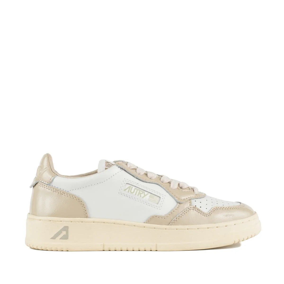 Color Item: White and beige | The Medalist sneaker is the everyday essential with Autry's signature attitude | The design combines tennis-related inspiration from the 1980s with quality materials and dynamic shapes that fit multiple looks and provide excellent comfort | This women's sneaker is made of soft, natural-looking white leather trimmed with beige patent leather inserts | Microperforated toe box provides excellent breathability, and the heel and outer side details are customized with the Autry logo | Leather upper | Microperforated toe box | Cotton flat laces | Embroidery label stitched on tongue | Padded collar | Leather and cotton terry lining | Leather insole raised 2 cm | Rubber sole | Sole height: 2.5-3.5 cm | Custom fabric pouch | Upper: 100% Leather | Lining: 40% Leather, 50% Cotton terry, 10% Nylon | Outsole: 100% Rubber Gender: Women Material: LEATHER Color: BEIGE, WHITE Made in: Imported Product ID: AULW RT01 *Import tax/duty will be calculated at checkout (If applicable)