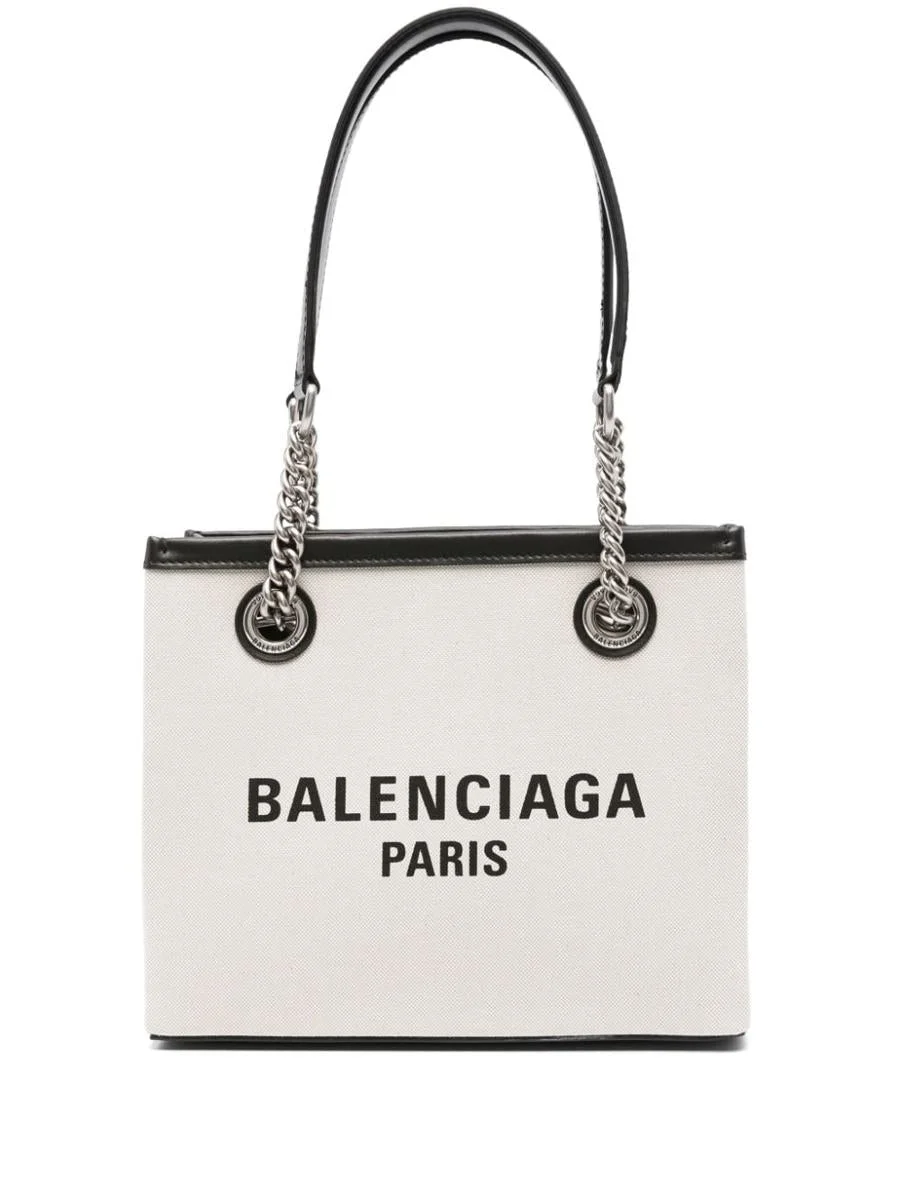 Balenciaga's tote bag crafted in natural-colored canvas with black smooth leather trims and contrasting logo print on front. It features antique silver-tone hardware and removable chain handle with leather reinforcement. Black canvas-lined interior with zip pocket. Gender: Women Material: T COTTON 80% T DOMESTICATED CALF LE 20% Color: NATUREL Made in: IT Product ID: 7599412AAOK9260 *Import tax/duty will be calculated at checkout (If applicable)