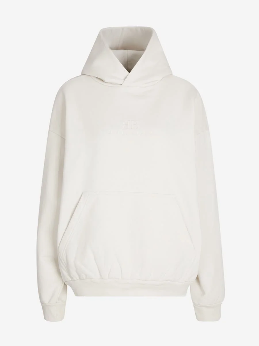 Sweatshirt by Balenciaga Oversized fit Cotton fabric Embroidered logo on the front Ribbed cuffs and hem Integrated hood Kangaroo pocket Back length: 72 cm Made in Portugal 100% Cotton Gender: Women Material: 100% COTTON Color: Beige Made in: PT Product ID: 767877 TQVS9TQVS9_9121ECRU *Import tax/duty will be calculated at checkout (If applicable)