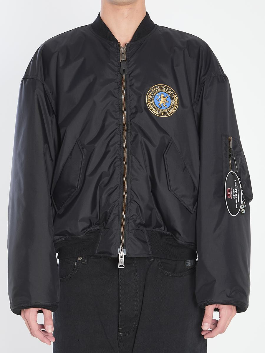 Balenciaga Black Jacket, Zip Closure, Frontal Patch Logo, Frontal Pockets, EU SIZE (IT) Gender: Men Material: 100%POLYAMIDE Color: Black Made in: Italy Product ID: 839101TOO041000 *Import tax/duty will be calculated at checkout (If applicable)