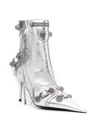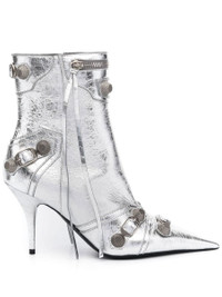 Cagole 90mm metallic ankle boots from BALENCIAGA featuring silver-tone, calf leather, metallic finish, silver-tone stud detailing, zip detail, side zip fastening, ankle-length, pointed toe and high stiletto heel. Conscious: We've partnered with Good On You – an ethical agency that rates how sustainably brands perform. This item comes from a brand that performs well in relation to their impact on the planet.. Heel 3,5 in / 9 cm Gender: WOMEN Material: CALF LEATHER 100% Color: SILVER Made in: IT Product ID: 694379WBDK38018 *Import tax/duty will be calculated at checkout (If applicable)