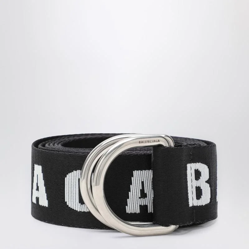 Balenciaga belt in black mixed nylon with contrasting unity sports icon pattern, jacquard logo lettering, metal tip with engraved logo, antiqued silver finishes, and adjustable closure. Gender: Men Material: 50% Polyamide - 50% Polyester Color: Black Made in: Italy Product ID: 7944852AA5V/R_BALEN-1090 *Import tax/duty will be calculated at checkout (If applicable)